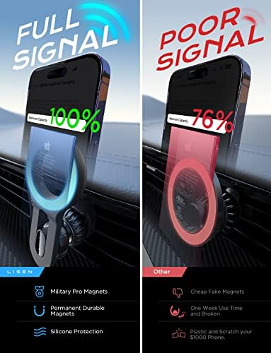 👍More Stable, Less Blocking: LISEN brand laboratory has upgraded this MagSafe car mount in 3 directions.1.Upgrade extension arm to protect your phone from overheating crash; 2.Cell phone holder for car mount with the most stable “Steel Hook”;3.Magnetic phone holder car that has the strongest magnet force, which can hold up to 10 iPhone 15 Pro Max. LISEN provides at least 1 year of user service.